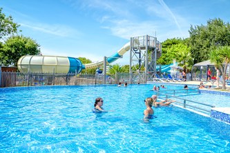 Sur place : piscine couverte chauffée, pataugeoires pour enfants, restaurant et bar-snack. Les hébergements en mobil-homes et chalets accueillent 3 à 8 personnes selon les modèles.